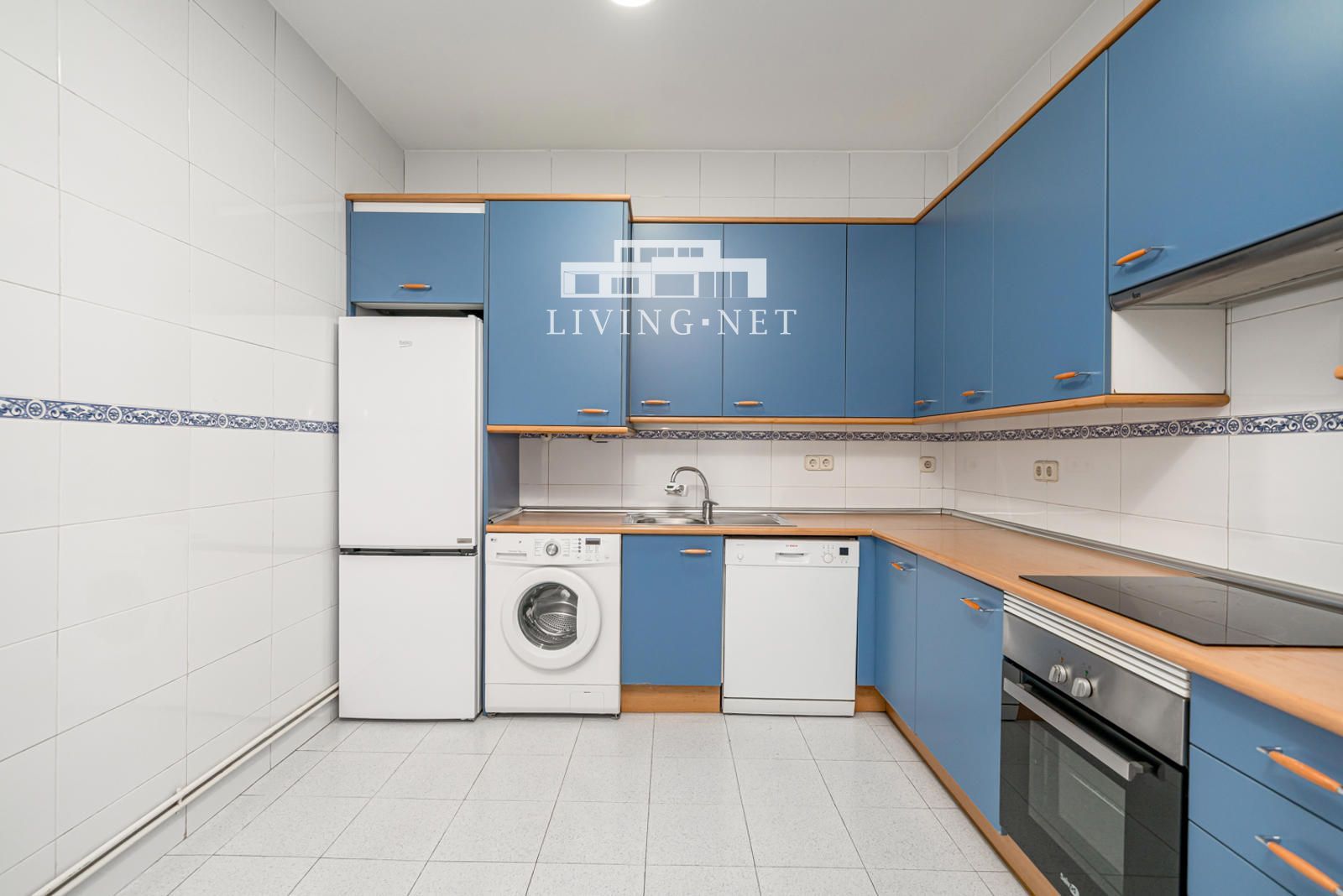 Gran cocina contigua a la zona de recibo, completamente equipada, con espacio para comedor de diario. Incluye nevera, congelador, lavavajillas, horno, placa de inducción, campana extractora y lavadora.