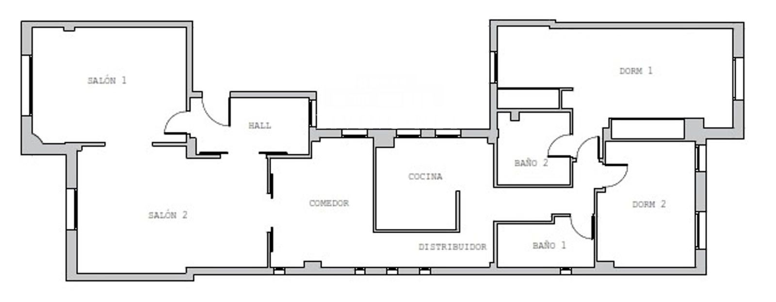 Actualmente se distribuye actualmente en: Buen hall con ventana a patio de luces, cuarto de estar con ventana grande exterior, salón exterior en 2 ambientes con ventana amplia, ambos con orientación sur-oeste, comedor adyacente con otra ventana a patio de luces; cocina a patio de luces con otras 2 ventanas; zona de noche con dormitorio principal en suite grande (en origen 2 dormitorios), y otro dormitorio doble amplio con cuarto de baño exterior. Ambos a patio de manzana con vista muy amplia y luminosa.