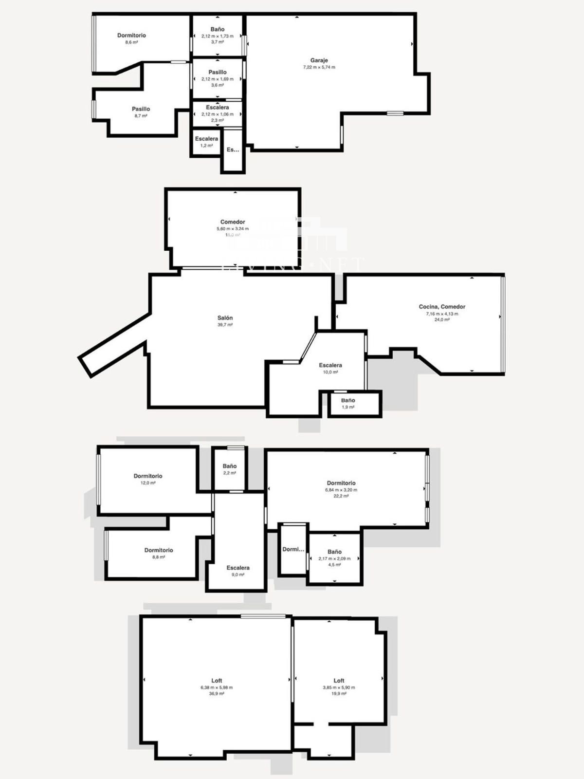 - Primera planta: Dormitorio principal con vestidor y cuarto de baño en suite, y otros 2 dormitorios que comparten un cuarto de baño exterior.